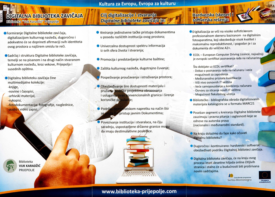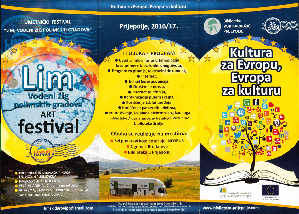 Пројекат „Култура за Европу, Европа за културу“ Библиотека „Вук Караџић“ у Пријепољу успешно је реализовала заједно са партнерима из Црне Горе 2016-2017. године, са циљем јачања сарадње, очувања мултикултурализма и промовисања културне баштине.